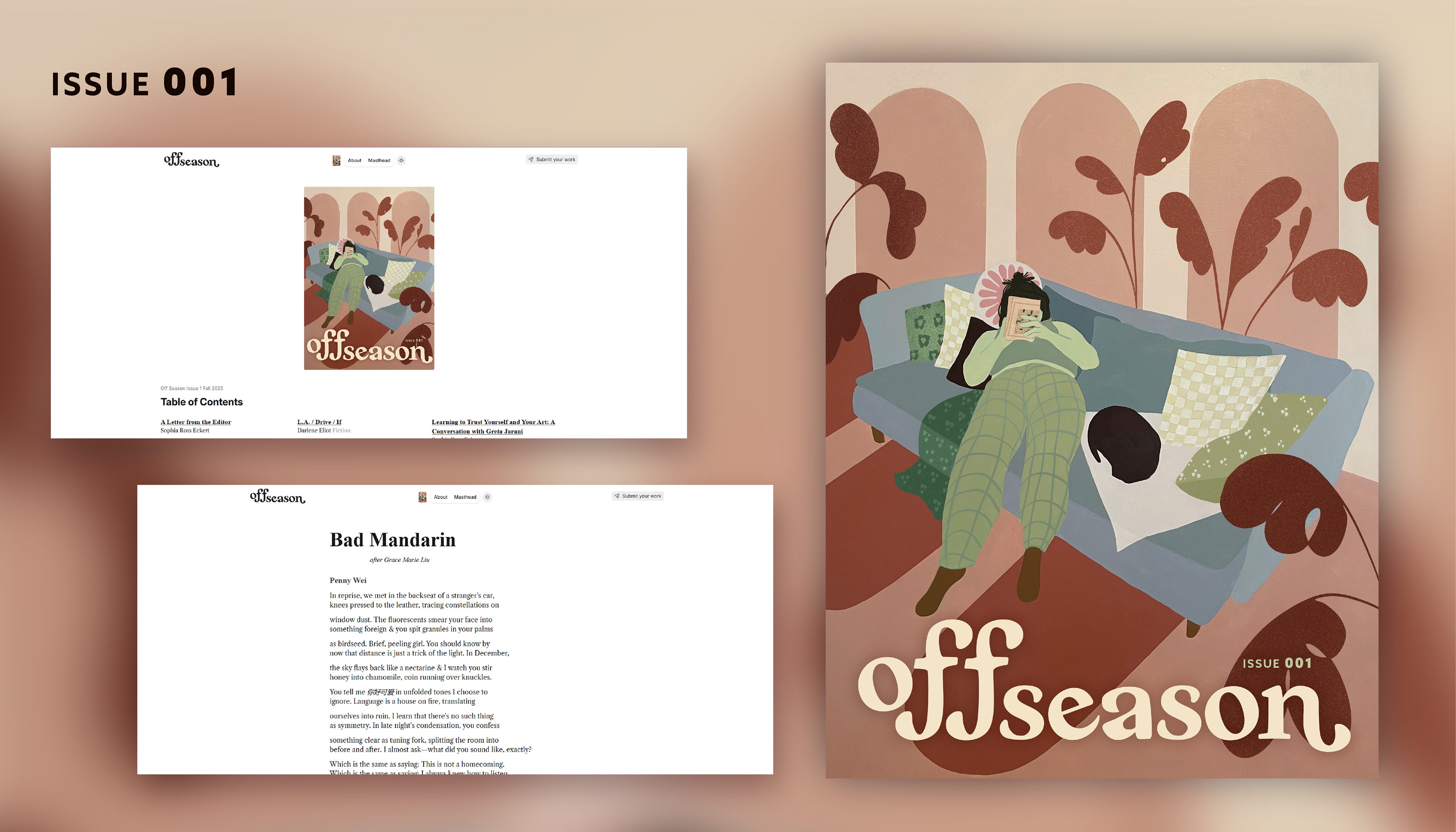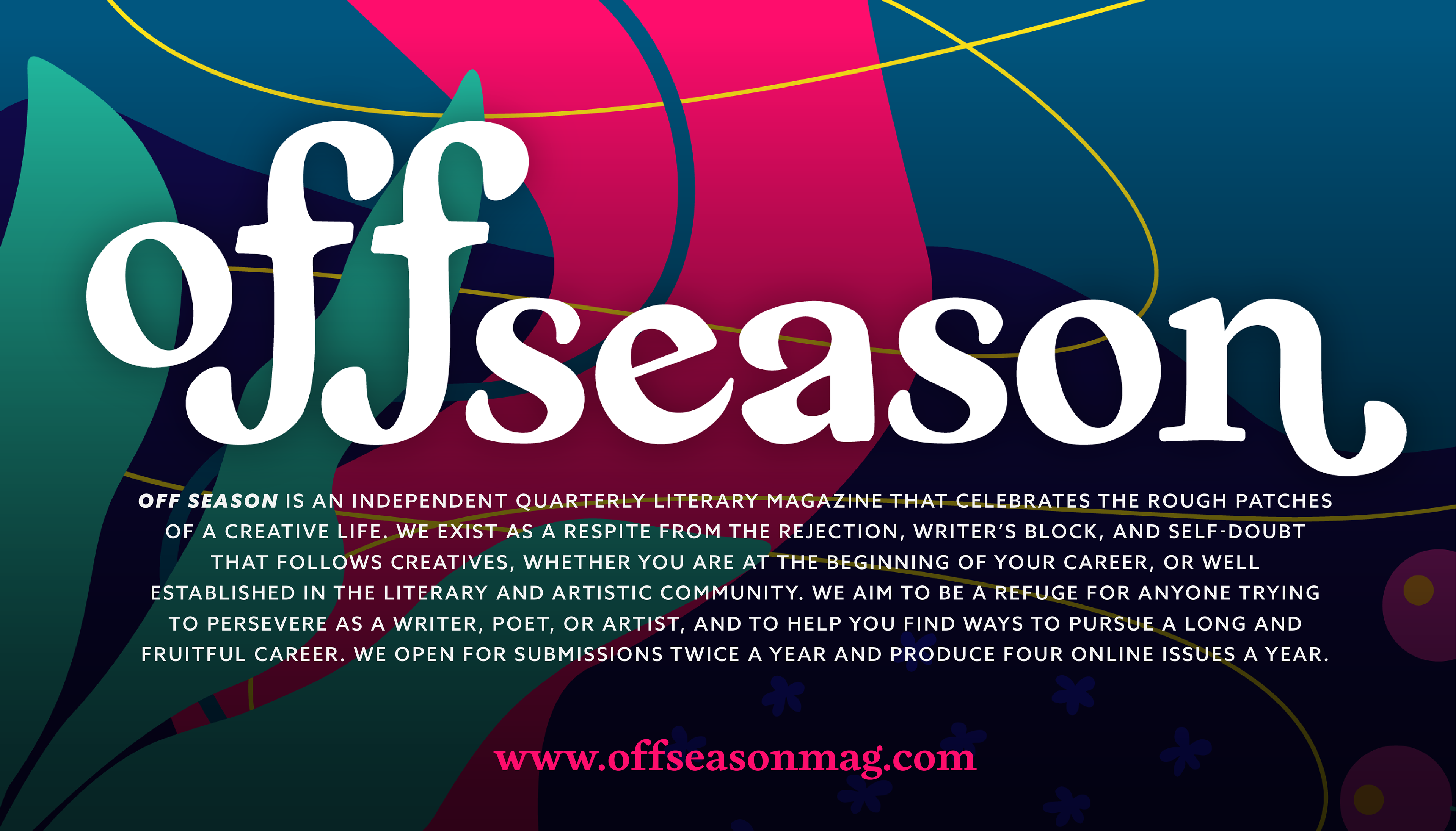 Off Season is an independent quarterly literary magazine that celebrates the rough patches of a creative life. We exist as a respite from the rejection, writer’s block, and self-doubt that follows creatives, whether you are at the beginning of your career, or well established in the literary and artistic community. We aim to be a refuge for anyone trying to persevere as a writer, poet, or artist, and to help you find ways to pursue a long and fruitful career. We open for submissions twice a year and produce four online issues a year.